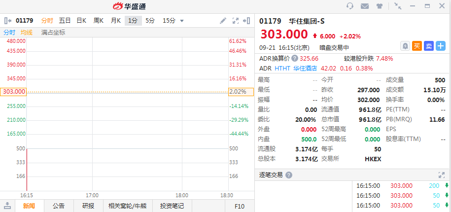 华盛资讯9月21日消息,中国第二大酒店集团(以经营的酒店客房数量计)华住酒店-S(01179.HK)暗盘交易开始,截至16:17报价303.0港元,每手50股,涨幅2.02%,每手账面赚300港元,最新市值961.8亿港元。