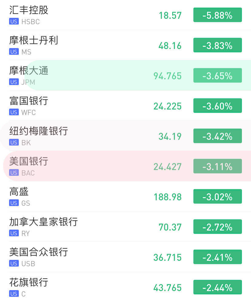 华盛资讯9月21日讯,受涉嫌转移可疑资金影响,美股银行股集体大跌。截止发稿汇丰控股跌近6%,摩根士丹利、摩根大通跌近4%,富国银行、纽约梅隆银行、美国银行、高盛均跌超3%。