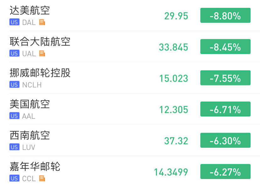 华盛资讯9月21日讯,受欧洲疫情二次爆发影响,邮轮航空板块集体下挫。截止发稿,达美航空跌近9%,联合大陆航空跌超8%,挪威邮轮控股跌超7%,美国航空、西南航空、嘉年华邮轮跌超6%。