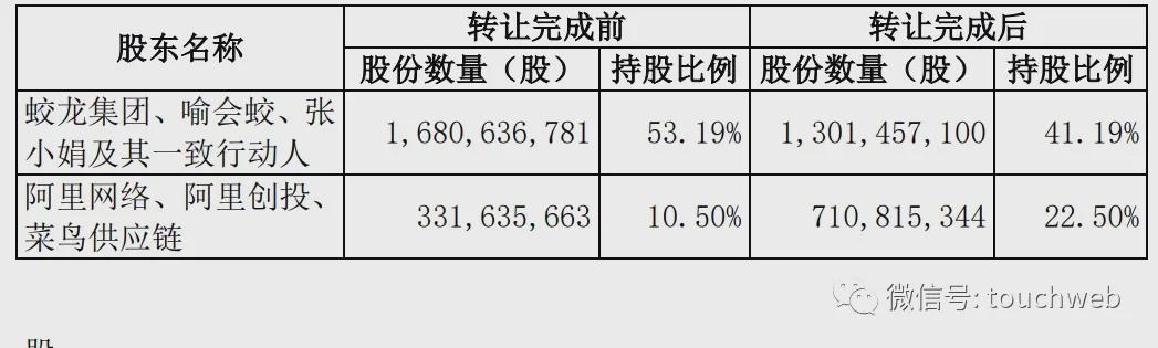 此前,圆通速递称,为强化公司与阿里巴巴集团之间的资本合作纽带,促进双方共同推进快递物流、航空货运、国际网络及供应链、数字化技术等的协同合作和优势互补,增强双方全球化综合服务能力,蛟龙集团、喻会蛟、张小娟与阿里网络于2020年9月1日签署《股份转让协议》,通过协议转让方式向阿里网络转让公司股份379,179,681股,占公司股份总数的12%。