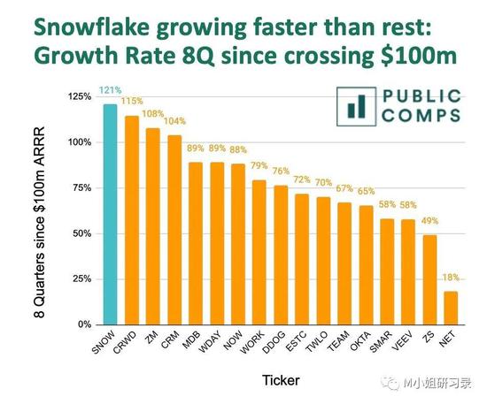 一般来说,$100M annual revenue是SaaS公司的一个坎(IPO的基本要求吧), Snowflake 2020年收入在$400-500M的规模,还能保持这样行业领先的增速,绝对是不多见的。