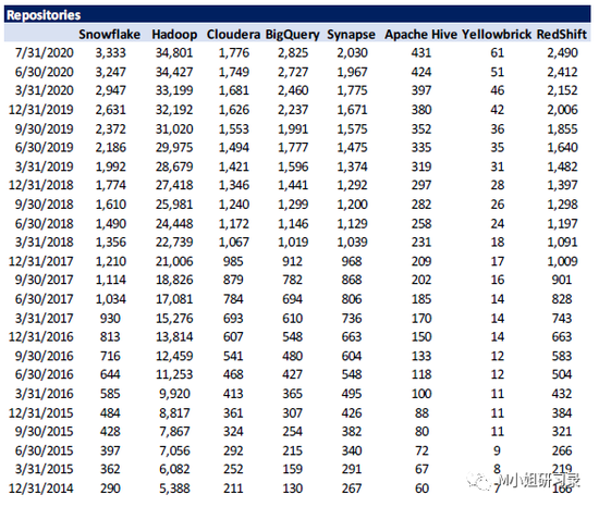 他们比较了几个主流数据产品在Github里repository的数量。2020年8月的数据是这样的: