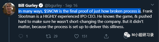 果不其然,Snowflake上市之后,Bill写了很长的Twitter,毫不客气地指出,Snowflake的上市是“IPO这个过程非常broken的终极证明”,不论CEO Frank Slootman多么有经验,还是被这个“从设计上就导致愚蠢”的流程打败了(我也被自己的翻译能力打败了,请见谅!)。