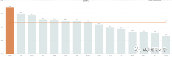 这种销售模式成本高,所以Snowflake 的Sales& marketing 花费占收入的比重在SaaS公司中是最高的。