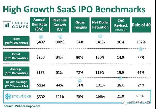 可以看到,最常用的SaaS几个指标,Snowflake跟目前市场上高速增长的SaaS公司相比,都属于绝对的头部玩家。