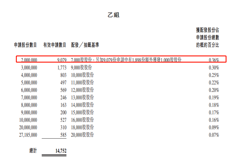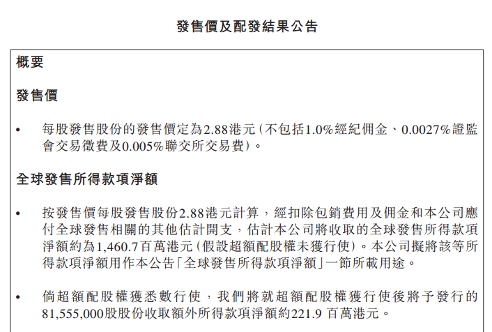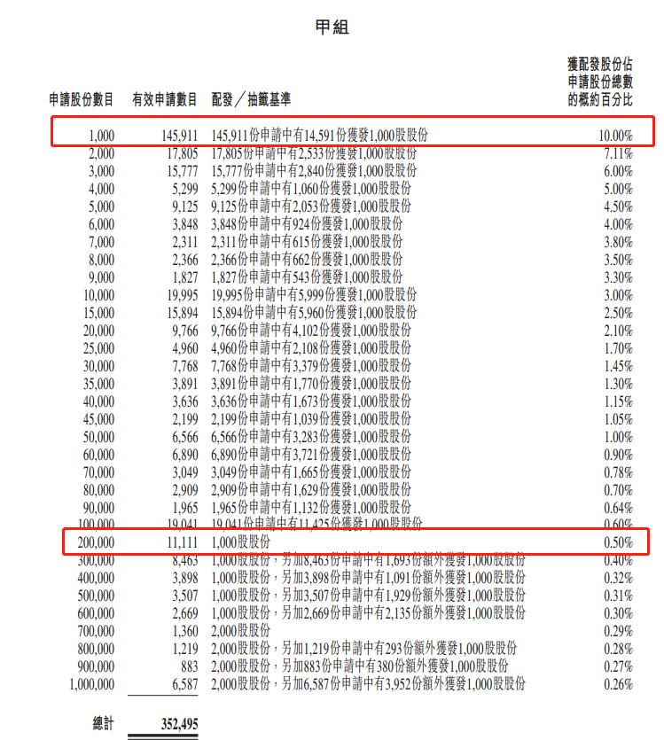 国际发售初步提呈的发售股份获踊跃超额认购约24.0倍。国际发售共有457 名承配人。五手或以下的股份已配发予合共61名承配人,相当于国际发售 项下承配人总数约13.3%。假设超额配股权未获行使,经重新分配后,该等 承配人已获配发国际发售项下271,850,000股发售股份的约0.06%及全球发 售项下发售股份的约0.03%。分配给国际发售承配人的发售股份最终数目 为271,850,000股发售股份,相当于全球发售初步可供认购发售股份总数的 50%(假设超额配股权未获行使)。