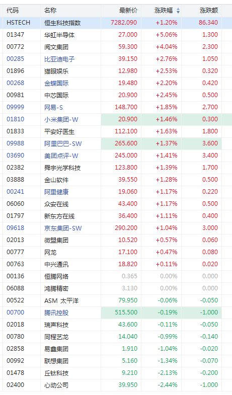 华虹半导体涨超5%,阅文集团涨超4%;比亚迪电子、中芯国际、猫眼娱乐、金蝶国际涨超2%。