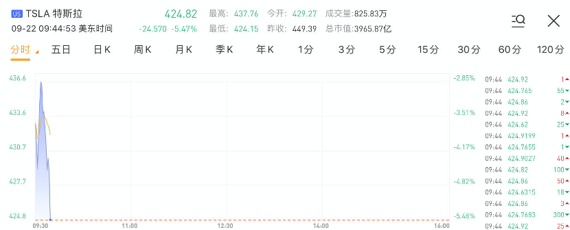 华盛资讯9月22日讯,受“电池日”产品大规模生产仍需延期影响,特斯拉盘中一度大跌近6%。截止发稿,特斯拉跌5.47%,报424.82美元,当前总市值3965.87亿美元。