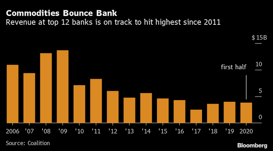 Coalition Development Ltd.的数据显示,2020年上半年全球12家最大银行的大宗商品总净收入跃升至38亿美元,并有望在整个年度超过70亿美元。果真如此,将是华尔街自2011年以来大宗商品收入最高的一年。
