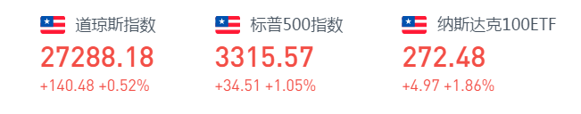 截至收盘,标普500指数涨34.5点,涨幅1.05%,报3315.57点;纳斯达克指数涨184.8点,涨幅1.71%,报10963.64点;道琼斯指数涨140.5点,涨幅0.52%,报27288.18点。