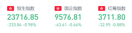 恒生指数开盘跌0.46%,午前呈横盘震荡走势,午后单边走弱。截至收盘,恒生指数跌233.84点或0.98%,报23716.85点,全日成交额达1055.16亿。国企指数跌0.66%,报9576.81点,红筹指数跌0.88%,报3711.8点。
