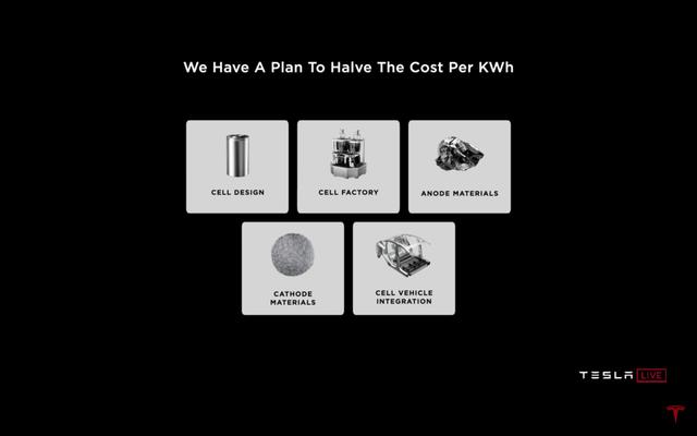 1、电池日发布的5项新电池技术,整体上能使电池续航能力提升50%,且生产成本大幅下降。