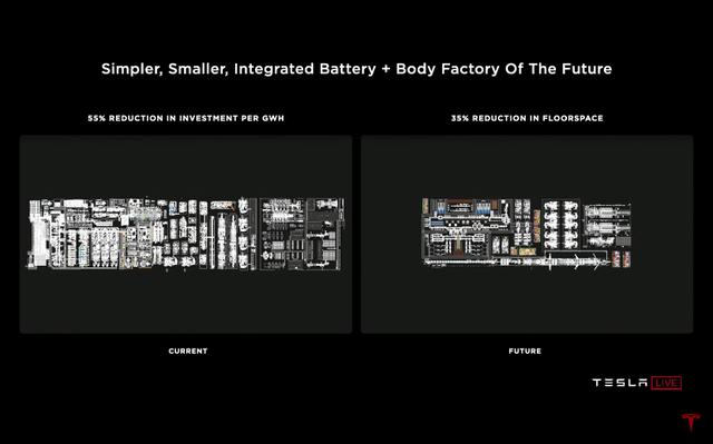 电池和车的一体化方面,特斯拉在电池设计上简化了电池结构,移除了电池组间不必要的部件,使电池体积减少了35%,并将电池放置到底盘的中间位置。新电池结构减少了约370个不必要的电池部件,将降低10%的电池重量并提升14%的续航能力。“未来不使用这种电池结构的汽车生产商将不再具备竞争性。”马斯克自信满满地表示。