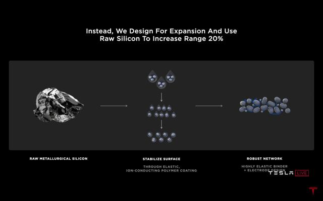 阳极材料方面,特斯拉将从硅材料入手。硅可以储存比石墨多出十倍的电能,但由于其在充放电过程中体积变化可达400%,容易破碎,因此一直难以取代石墨。特斯拉计划从根本上改变硅表层的延展性,使其不容易破碎,这项技术可以使电池的续航能力增加20%。特斯拉将研制的新材料命名为“特斯拉硅”,成本为1.2美元/KWh,仅为现有的结构化硅工艺的十分之一。