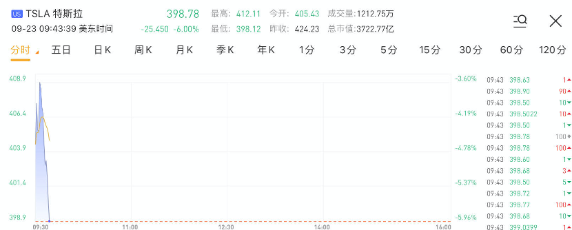 华盛资讯9月23日讯,或因市场对普遍期待的电池日感到失望,特斯拉一度跌超6%。截止发稿,特斯拉跌6%,报398.78美元,当前总市值3722.77亿美元。