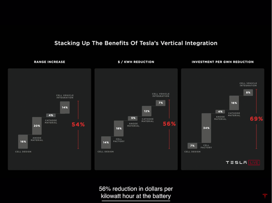 在电池产能建设方面,特斯拉将实现69%的降本。