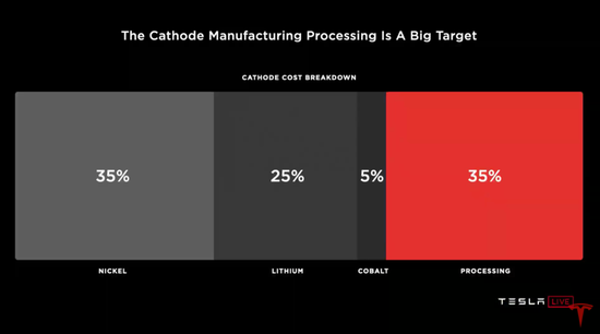 特斯拉认为,在正极材料的总成本中,加工过程就占了35%,需要大力缩减。