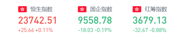 恒生指数开盘跌0.07%,盘中一度跌超100点,全天呈窄幅震荡走势。截至收盘,恒生指数涨25.66点或0.11%,报23742.51点,全日成交额达984.84亿。国企指数跌0.19%,报9558.78点,红筹指数跌0.88%,报3679.13点。