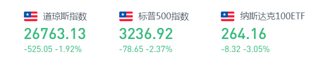 截至收盘,标普500指数跌78.70点,跌幅2.37%,报3236.92点;纳斯达克指数跌330.70点,跌幅3.02%,报10632.99点;道琼斯指数跌525.00点,跌幅1.92%,报26763.13点。