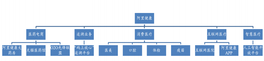 阿里健康当前业务结构 = 医药电商(直营+第三方+线下020)+ 消费医疗(为集团投资的美年健康、爱康国宾,合作的隐适美等消费类医疗服务打造电商渠道和线上广告,获取抽成及流水)+ 偏福利性业务(药品追溯平台、药物咨询服务、衢州慢病管理平台等)。收入占比(FY20)= 医药电商(97%) + 消费医疗(2%)+ 偏福利性业务(1%)。