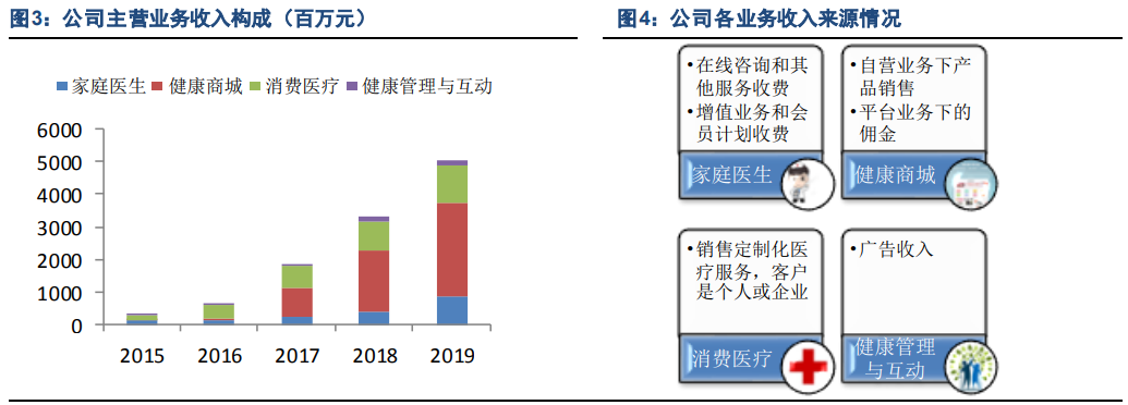 公司四大板块业务收入来源各不相同。家庭医生业务通过在线咨询和其他服务收费,以及通过增值业务和会员计划收费;健康商城业务通过自营业务产品销售获得收入,并通过平台业务获取佣金;消费医疗业务向个人或企业销售定制化医疗服务;健康管理与互动业务则通过广告获得收入。