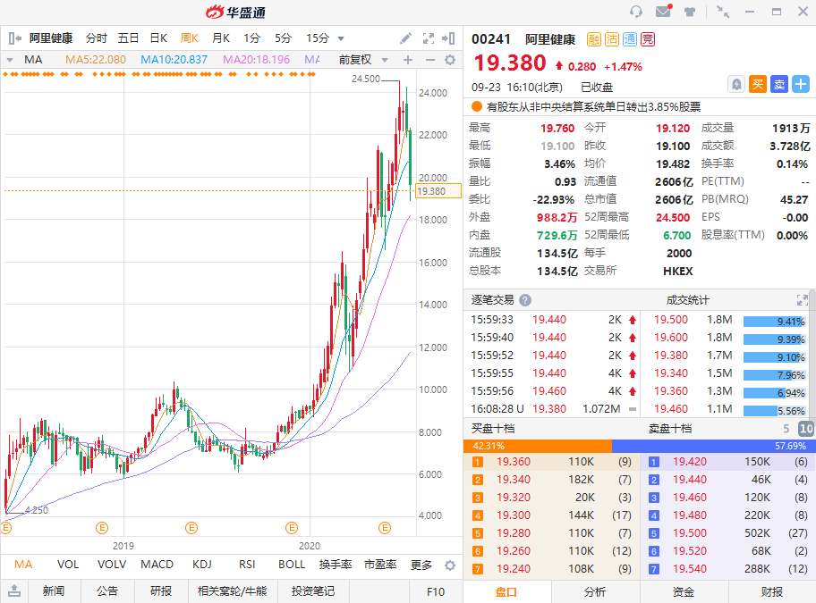 阿里健康的股价也从疫情以来一飞冲天,从2019年的6元左右,到2020年最高点24.5,最高涨幅达4倍。
