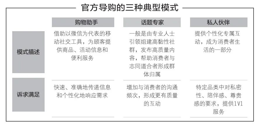 目前,通过将官方导购的能力模型与不同角色定位和行业特征结合,形成了三种被实践验证有效的典型模式,分别是购物助手、话题专家和私人伙伴。