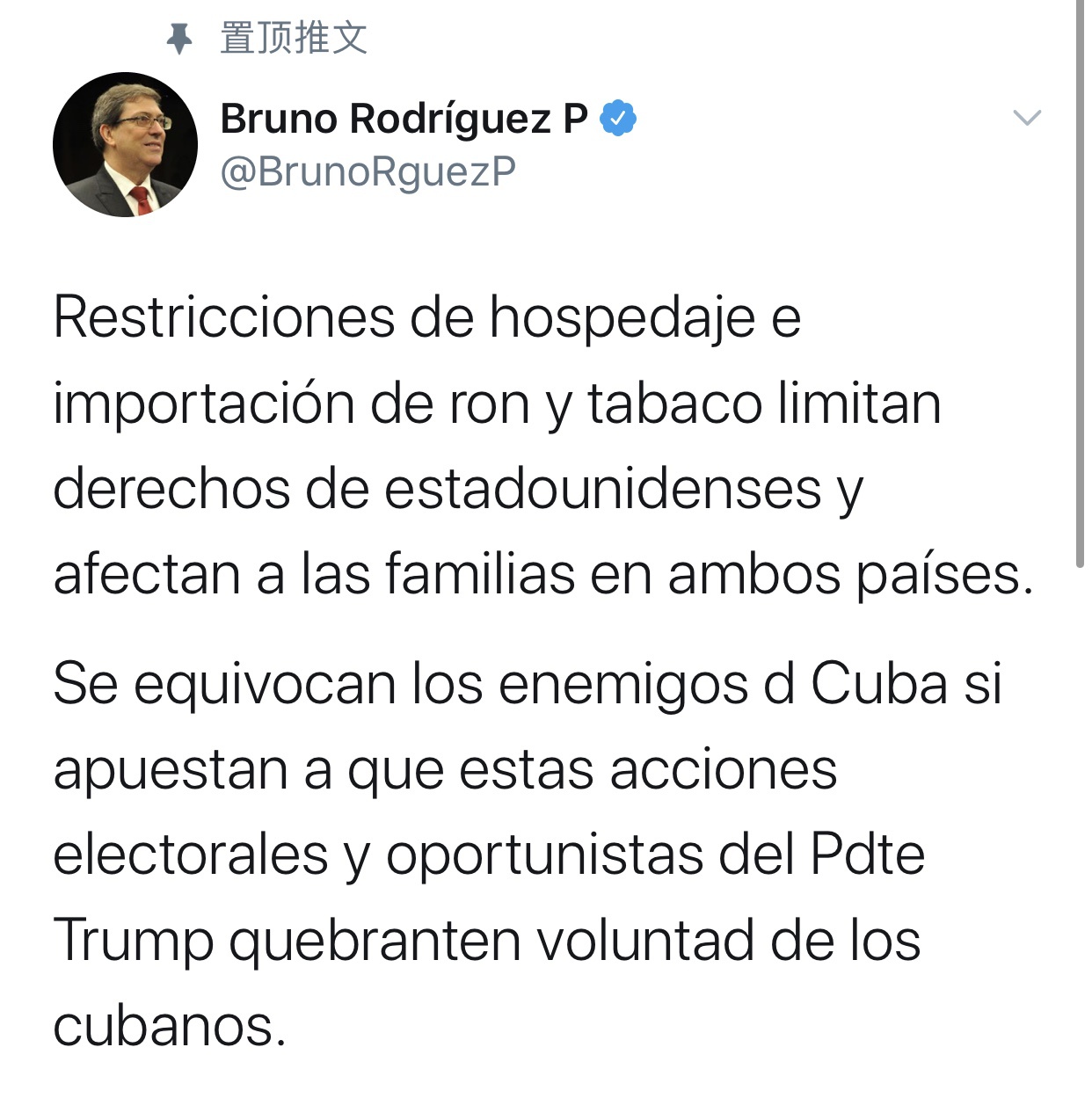 古巴外长布鲁诺·罗德里格斯谴责道,该政策限制了美国公民权利,并影响了两国人民的家庭。如果美方以为特朗普总统以选举为目的做出的投机主义行为会破坏古巴人民的意志,那就大错特错了。