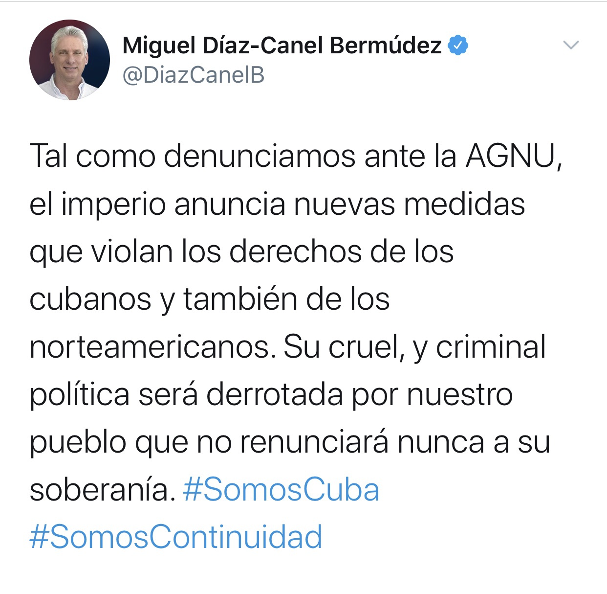 古巴国家主席迪亚斯-卡内尔在社交网站上发文表示,美国宣布的新制裁措施侵犯了古巴公民和美国公民的权利,这项残酷政策将被古巴人民打败,古巴永远不会放弃其主权。
