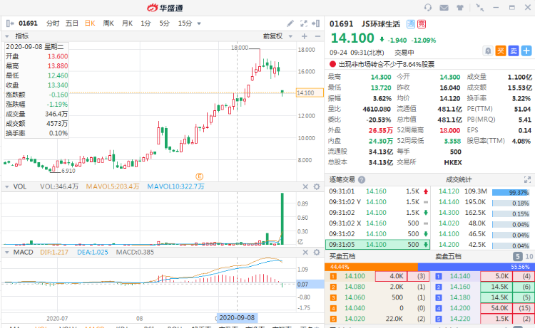 9月24日消息,JS环球生活开跌12.09%,报14.1港元。公司拟先旧后新配售股份,总筹约10.8亿港元。