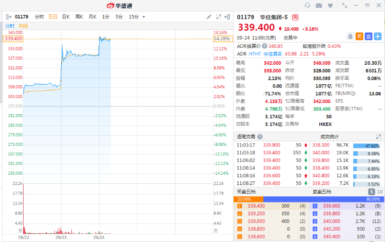 格隆汇9月24日丨华住集团(1179.HK)逆市再涨逾3%,报339.4港元,总市值1077亿港元。