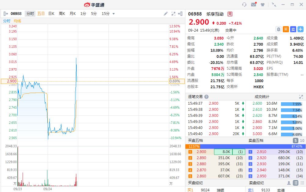 乐享互动午后突然飙升,目前涨超7%,股价报2.9港元,回到发行价上方。