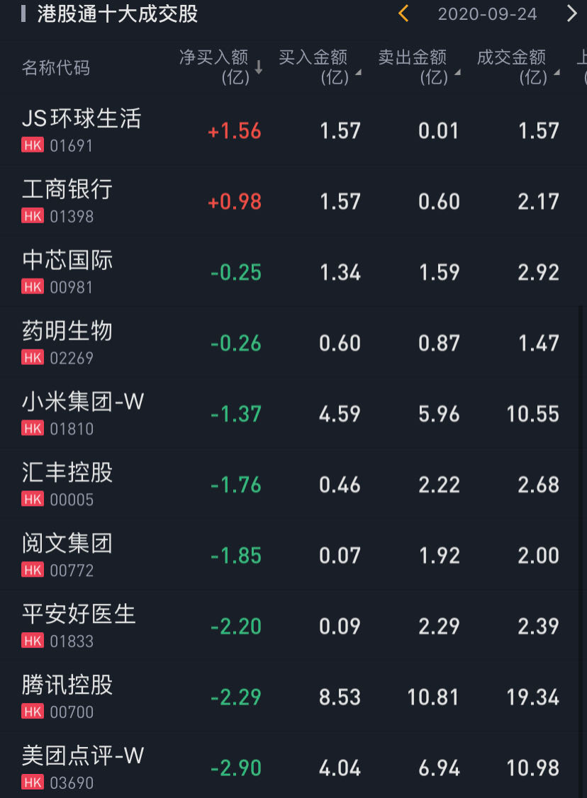 此外,南下资金净卖出美团点评2.90亿港元,净卖出腾讯控股2.29亿港元,净卖出平安好医生2.20亿港元。