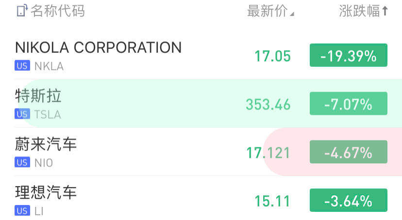 华盛资讯9月24日讯,美股新能源汽车股全线大跌,Nikola跌近20%。截止发稿,特斯拉跌7.07%,蔚来汽车跌4.67%,理想汽车跌3.64%,氢能源汽车商Nikola跌19.39%。