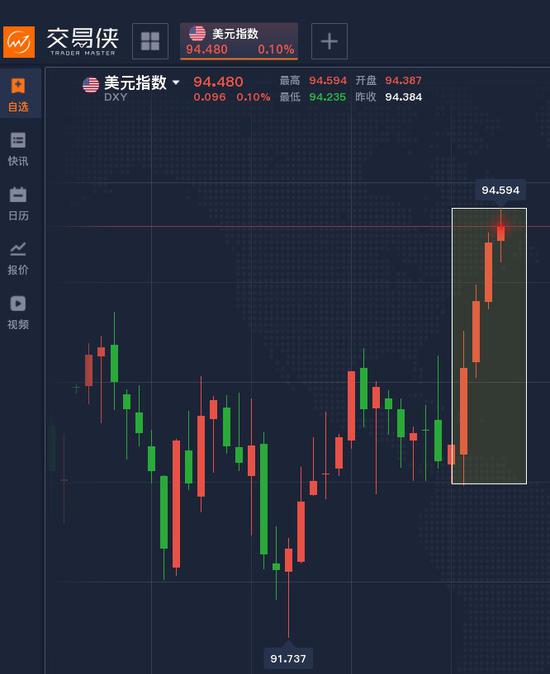 美元指数继续攀升,目前已经站稳94关口,一度逼近94.6,日线图中更是实现四连阳。