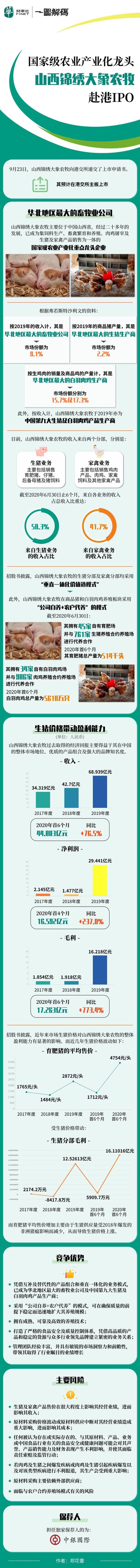 9月23日,山西锦绣大象农牧股份有限公司向港交所递交了上市申请书,预计在港交所主板上市。山西锦绣大象农牧主要位于中国山西省,经过二十多年的发展,已成为集饲料生产、畜禽繁育和养殖、肉鸡屠宰及生猪及家禽产品销售为一体的国家级农业产业化重点龙头企业。