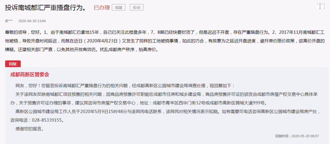 这份文件的真实性,已经得到确认。另据官方回复,涉及捂盘惜售的项目,正是成都著名的神盘南城都汇。