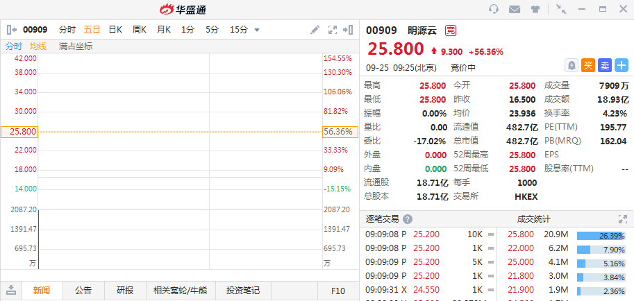 华盛资讯9月25日消息,明源云(00909.HK)今日在港挂牌上市,开盘涨56.36%,盘前成交额18.93亿港元,最新总市值482.7亿港元。明源云昨日暗盘高开12%报18.5元,以贴近高位收盘报25.15元,较上市价16.5元,高52.4%或8.65元,成交3,830万股,涉资8.98亿元。不计手续费,每手1,000股,账面赚8,650元。