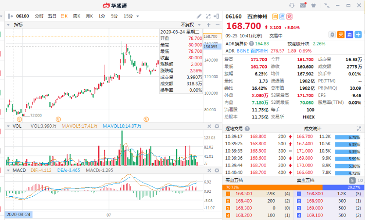 百济神州(6160.HK)高开上涨,急升至5.04%盘中破顶,现报168.7港元,暂成交2775万港元,最新总市值1982亿港元。