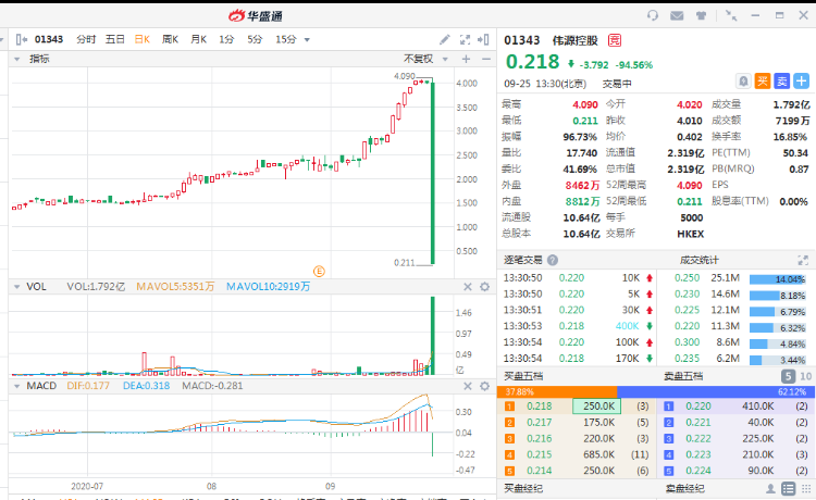 伟源控股午后跳水暴跌94%,公司近40亿市值蒸发,最新报价0.218港元,市值2.319亿港元。公司是一间位于新加坡的承建商,并专门向客户提供土木工程公用事业工程已逾28年。