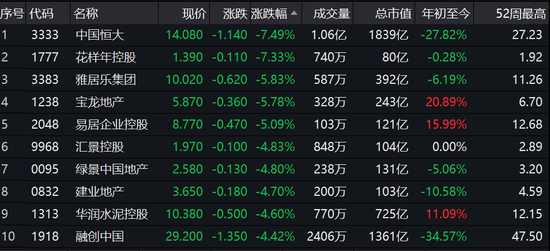 地产股集体大跌,其中,中国恒大跌7.5%,花样年控股跌7.3%,雅居乐、易居企业控股等跌超5%,建业地产、融创中国、富力地产跌超4%,龙光地产、世茂等跌超3%。