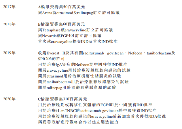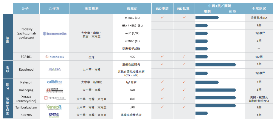云顶新耀已经建立了Sacituzumab govitecan,Eravacycline等众多潜在全球首创或同类最佳的分子组合,覆盖了肿瘤、免疫性疾病、感染性疾病、内科疾病疾4大领域,均在亚太地区具有临床未满足需求和数十亿元的销售市场潜力。云顶新耀拥有这些产品管线的大中华和部分亚洲权益。