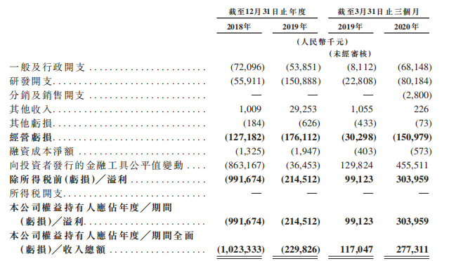 根据初步招股文件,目前云顶新耀未产生产品销售收入。2018年、2019年及截至2020年3月31日,公司经营亏损净额分别为人民币1.272亿元、1.761亿元、1.51亿元,经营亏损主要由研发开支以及一般及行政开支而产生。
