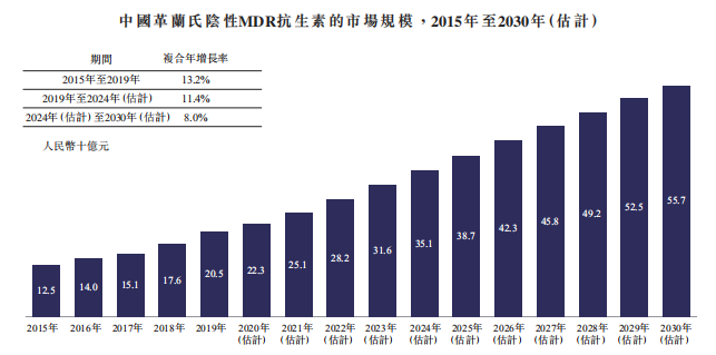 中国新型抗生素的市场非常强劲。根据弗若斯特沙利文报告,从2015年 至2019年,中国的抗感染药物市场已从人民币1,958亿元增至人民币2,255亿元,复合年增长率为3.6%。尤其是中国的抗感染药物市场,是中国最大的治疗领域之一,其商业收入与肿瘤和心血管疾病相似。前十大抗生素在中国的销售额均超过人民币20亿元。然而,该等产品中的大多数相对老旧,易于不断产生抗生素耐药,凸显对新治疗方法的需求。在抗生素分部,与整体抗感染市场相比,中国革兰氏阴性MDR (G-MDR)抗生素市场在过去五年中以更快的速度增长,从2015年的人民币125亿元增至2019年的人民币205亿元,复合年增长率为13.2%。市场于2024年预计将增至人民币351亿元,2019年至2024年的复合年增长率为11.4%, 到2030年将进一步增至人民币557亿元,2024年至2030年的复合年增长率为8.0%。
