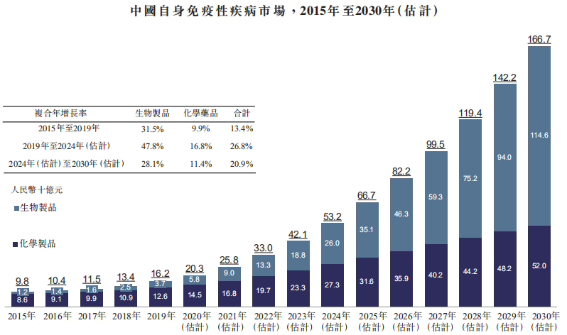 云顶新耀于免疫学方面的支柱资产及核心候选产品之一为etrasimod, etrasimod最初的适应症为溃疡性结肠炎(UC),但其后发现有机会适用于克隆氏症(CD)及自体免疫性皮肤病(如异位性皮肤炎),该等疾病过往在中国被漏诊及治疗不足。根据弗若斯特沙利文报告,自体免疫性疾病于2019年在中国的市场规模达人民币162亿元;预期于2024年时将扩大至人民币532亿元,复合年增长率为26.8%。