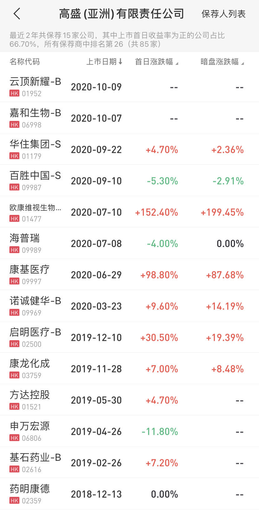 本次云顶新耀保荐的券商是高盛,从近两年数据来看,高盛共保荐15家公司,上市首日收益为正的概率占比66.7%。