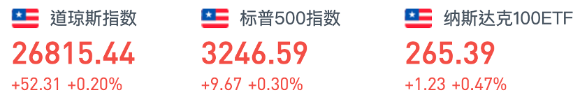 周四,美股在巨幅震荡后小幅收涨,科技股收复了近期的部分失地,投资者在权衡美国最新一批经济数据。道琼斯指数收于26815.44点,上涨52.31点,涨幅0.20%;该指数盘中巨幅震荡,最高上涨超300点,最低下跌226点。标准普尔500指数收于3246.59点,上涨0.30%;纳斯达克综合指数收于10672.27点,上涨0.37%。