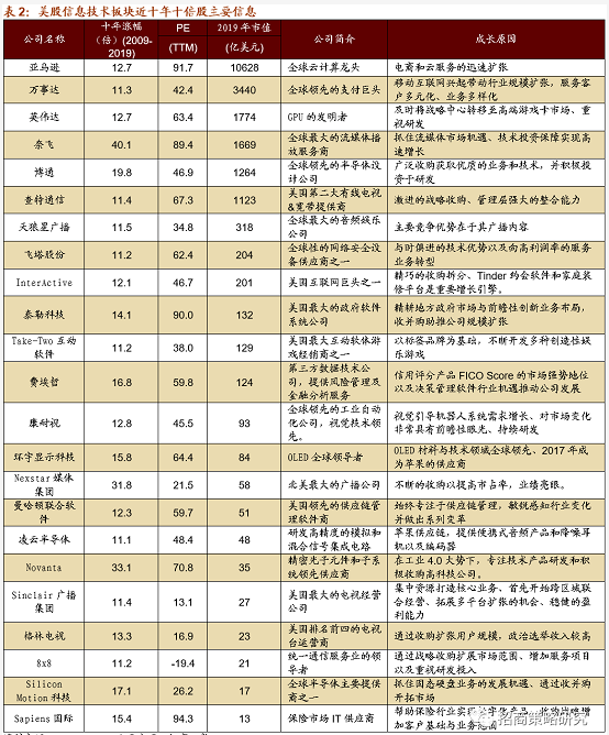 根据筛选,在2010年至2019年间美股股价上涨超过10倍并且2019年底市值大于10亿美元的公司有81家。而其中有14家都是信息技术行业,也就是科技行业。