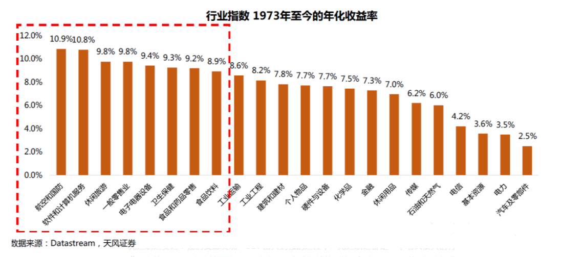 以1973年之后的美股为例,我们可以发现年化收益率最高的行业主要集中在三类:科技、医疗、消费。