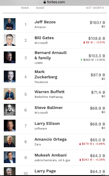 在2019年福布斯公布的,在世界富豪榜前十里,搞互联网(及软件)的占了6席。榜单里有亚马逊的贝佐斯、微软的比尔盖茨、脸书的扎克伯格、微软的前总裁鲍尔默、谷歌的拉里佩奇、甲骨文的拉里艾利森。